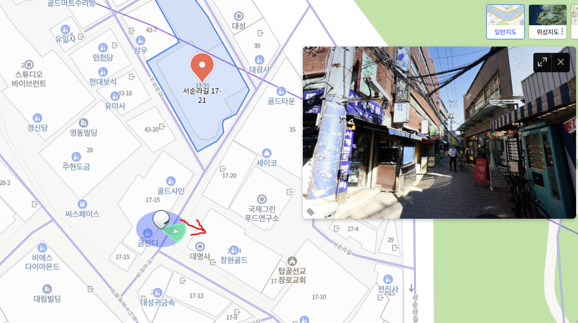 이 주소가 리폼을 해주는 곳은 아닙니다. 몇 분을 헤매면서 찾았던 위치가 바로 로드뷰 마크가 있는 장소입니다. 로드뷰가 있는 곳에 빨간색 화살표로 된 방향을 보게 되면 지도에 표시되지 않은 좁은 골목이 있습니다. 이 골목에 위치해 있습니다.