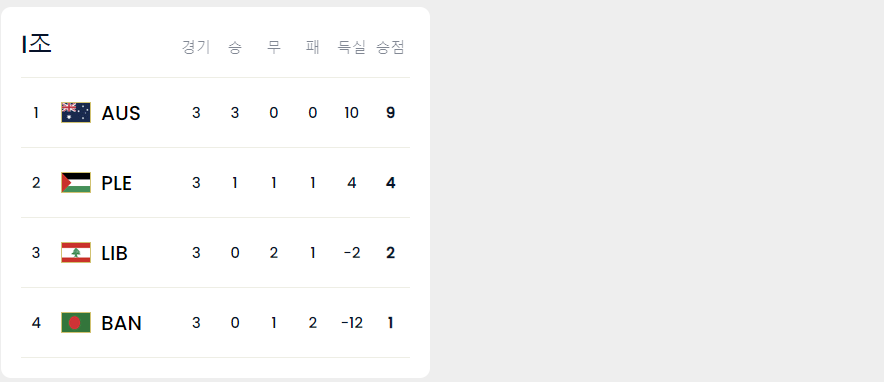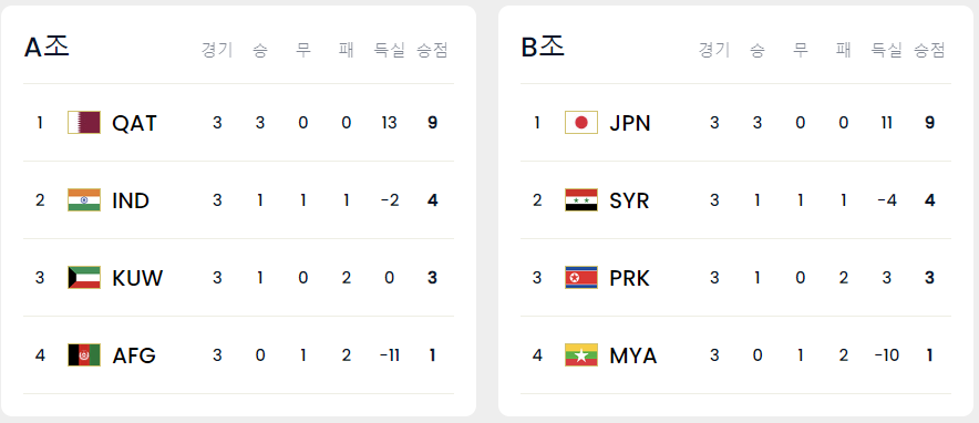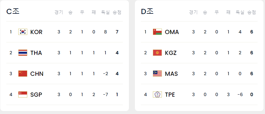 일시 경기 결과 23. 11.16(목) 20:00 대한민국 VS 싱가포르 대한민국 5 (승) : 싱가포르 0 (패) 23. 11.21(화) 21:00 대한민국 VS: 중국 대한민국 3 (승) VS: 중국 0 (패) 24. 03.21(목) 20:00 대한민국 VS 태국 대한민국 1(무) VS 태국 1(무) 24. 03.26(목) 21:30 대한민국 VS 태국 예정 24. 06.06(목) 싱가포르 VS 대한민국 예정 24. 06.11(화) 중국 VS 대한민국 예정 ✅ 월드컵 아시아 2차예선 A조, B조 성적