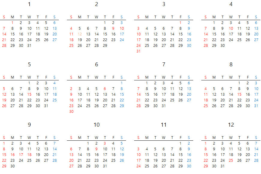 2024년 달력 및 공휴일을 미리 파악하셔서 가족들 또는 개인의 스케줄을 작성하는데 도움이 되었으면 합니다. 여행 계획을 사전에 세워 예약을 하면 항공과 호텔 등의 비용을 혜택 받을 수 있는 기회도 놓치지 않았으면 좋겠습니다. 2024년 달력 엑셀 필요하신 분은 자유롭게 다운로드하세요.